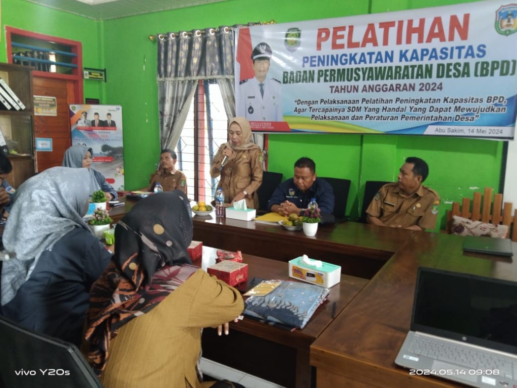 Camat Pondok Kelapa menghadiri dan membuka acara Pelatihan Peningkatan Kapasitas Anggota Badan Permusyawaratan Desa Desa Abu Sakim. dalam rangka pelaksanaan APBDes Desa Abu Sakim Tahun 2024 Bidang Pemberdayaan. Bertempat di Gedung Serba Guna Desa Abu Sakim, acara dihadiri oleh seluruh Anggota BPD dan perangkat Desa Abu Sakim.