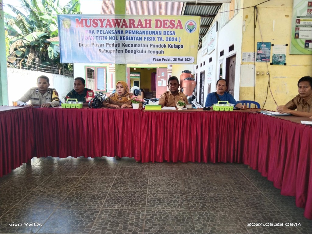 Camat Pondok Kelapa Lismawati, S.I.P. didampingi Kasi PMD Kecamatan Pondok Kelapa menghadiri undangan acara Musyawarah Desa Pra Pelaksanaan Pembangunan Desa Pasar Pedati dan Titik Nol kegiatan fisik DD Tahun Anggaran 2024. Bertempat di Balai Desa Pasar Pedati acara dihadiri juga oleh Bhabinsa,Bhabinkamtibmas, Ketua BPD dan Anggota, PDL,Kepala Desa dan Perangkat dan beberapa warga pengguna manfaat kegiatan tersebut.