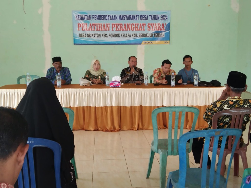 Camat Pondok Kelapa menghadiri acara Pelatihan Perangkat Syara' Program Dana Desa Tahun Anggaran 2024 Bidang Pemberdayaan yang diselenggarakan oleh Pemerintahan Desa Srikaton acara berlangsung di Aula Desa Srikaton acara diikuti 15 orang peserta dan dihadiri oleh Kepala Desa,Ketua dan anggota BPD, Perangkat Desa, Bhabinkamtibmas dan Wakapolsek Pondok Kelapa, Pendamping Desa, dan Pendamping Lokal Desa.