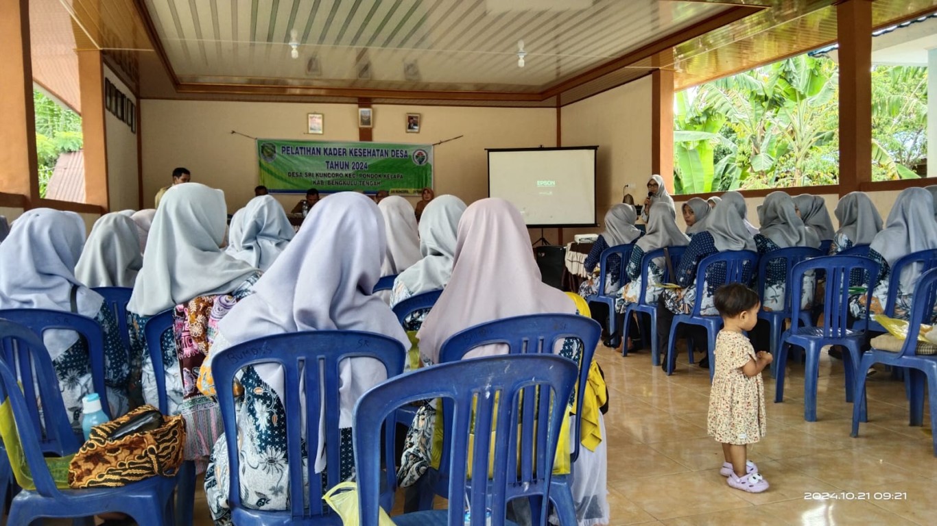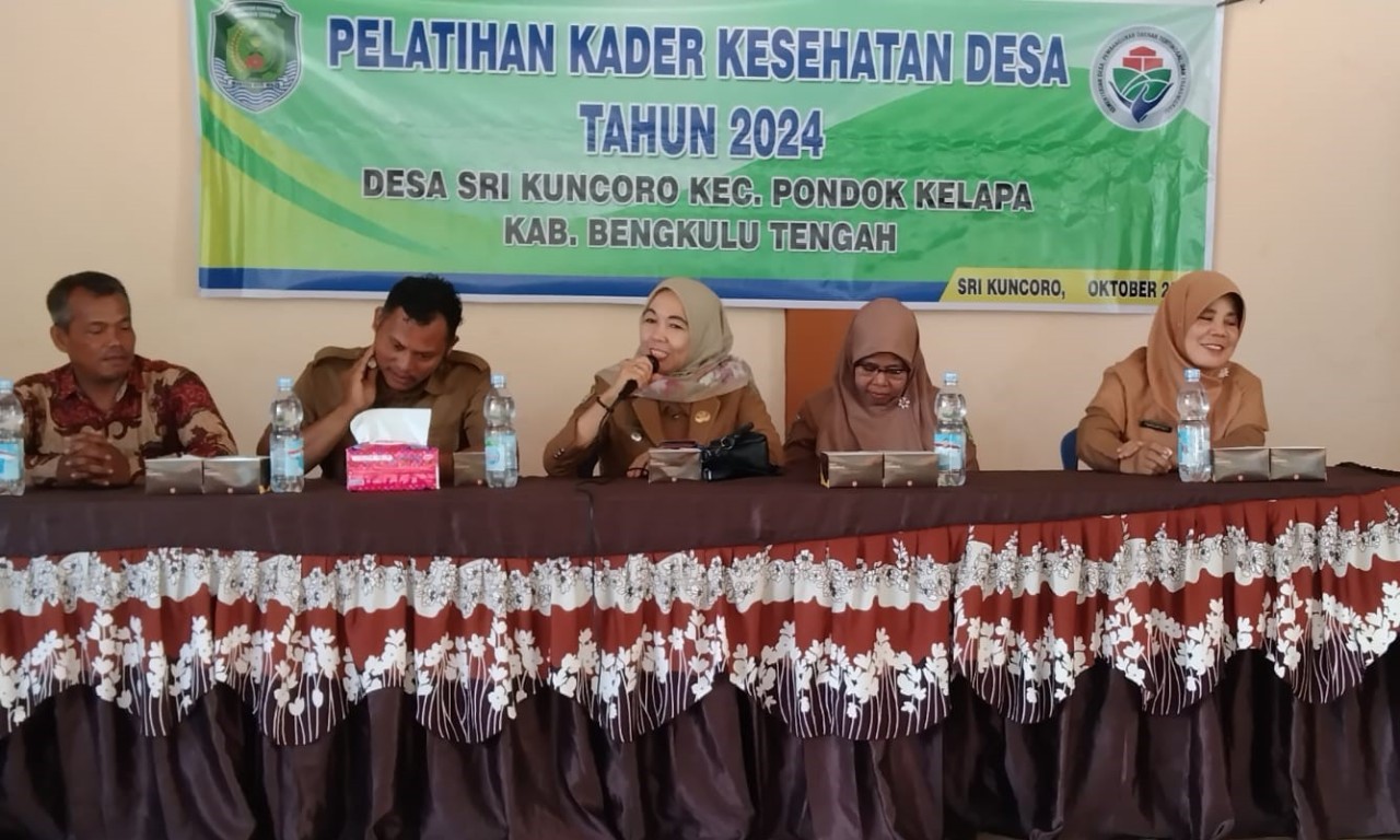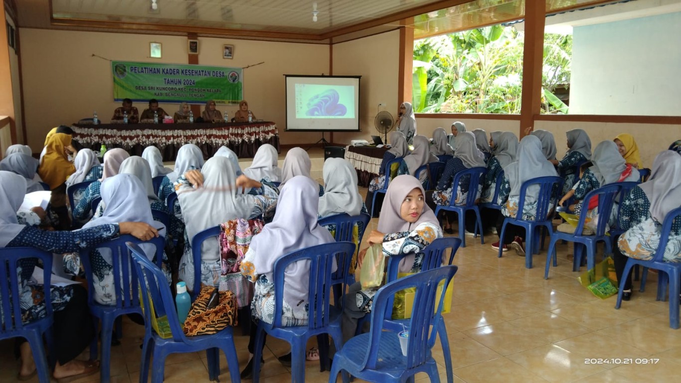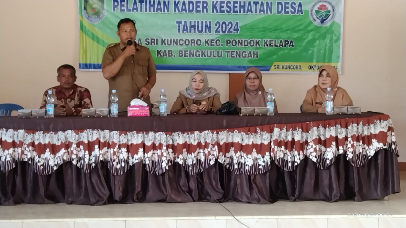 Pelatihan Kader Kesehatan terselenggara berdasarkan Pelaksanaan APBDes 2024 Desa Srikuncoro Bidang Pemberdayaan, bertempat di Balai Desa Srikuncoro acara diikuti oleh 50 orang Kader Kesehatan Desa yang terdiri dari Kader Poyandu Layanan Prima Kepala Puskesmas Srikuncoro (Nara Sumber), Kepala Dinas Kesehatan Bengkulu Tengah (Nara Sumber), Bhabinkamtibmas, Ketua BPD dan Pendamping Kecamatan.