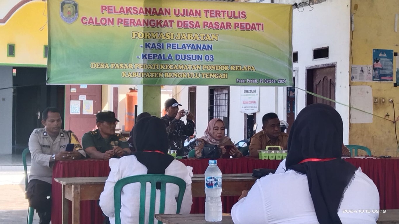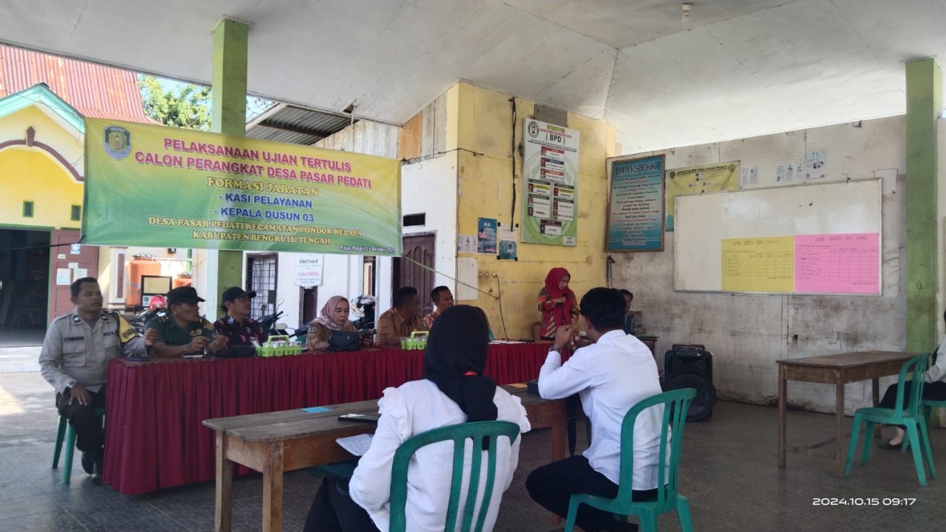 Desa Pasar Pedati Kec. Pondok Kelapa Kabupaten Bengkulu Tengah pada hari Selasa 15 Oktober 2024 melaksanakan Tes Ujian tertulis perangkat desa atas kekosongan jabatan Kasi Pelayanan umum dan Kepala Dusun 3 Desa Pasar Pedati. Ujian tertulis tersebut dilaksanakan setelah melalui tahapan-tahapan perekrutan yang dilaksanakan oleh Panitia Perekrutan yang dibentuk oleh Kepala Desa Pasar Pedati.
