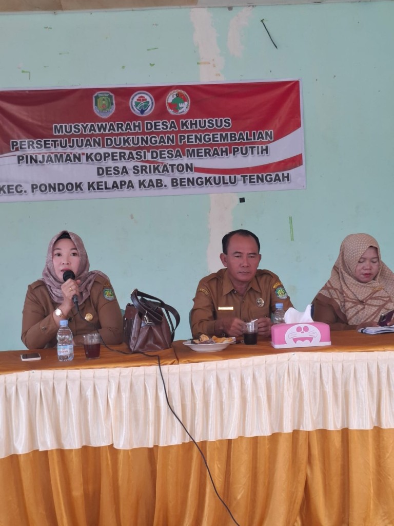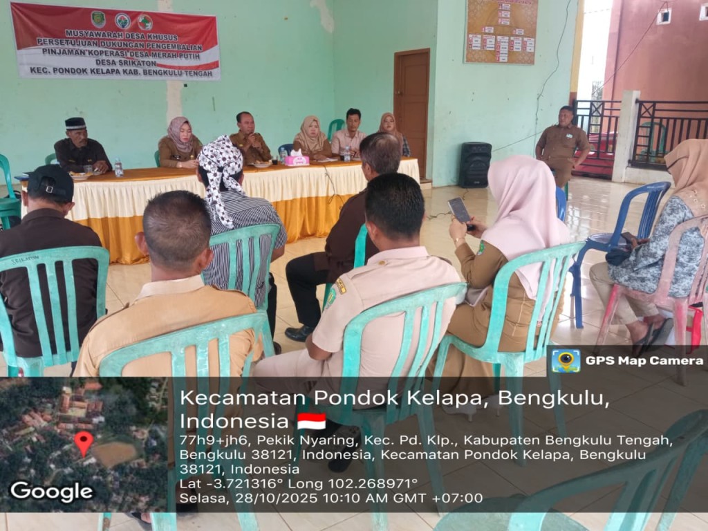 Camat Pondok Kelapa Ridulima, S.Sos., A.Kp., M.A.P menghadiri Musyawarah Desa Khusus Persetujuan Dukungan Pengembalian Pinjaman Koperasi Desa Merah Putih Desa Srikaton di Aula Desa Srikaton, yang dihadiri oleh Camat, Kasubbag Perencanaan dan Keuangan beserta staf Kecamatan, Kepala Desa beserta perangkat Desa, Ketua BPD Beserta Anggota. Pendamping Desa, Ketua Koperasi Merah Putih Desa Srikaton Bserta Anggota, dan Tokoh Masyarakat.Pada hari Selasa, 28 Oktober 2025.