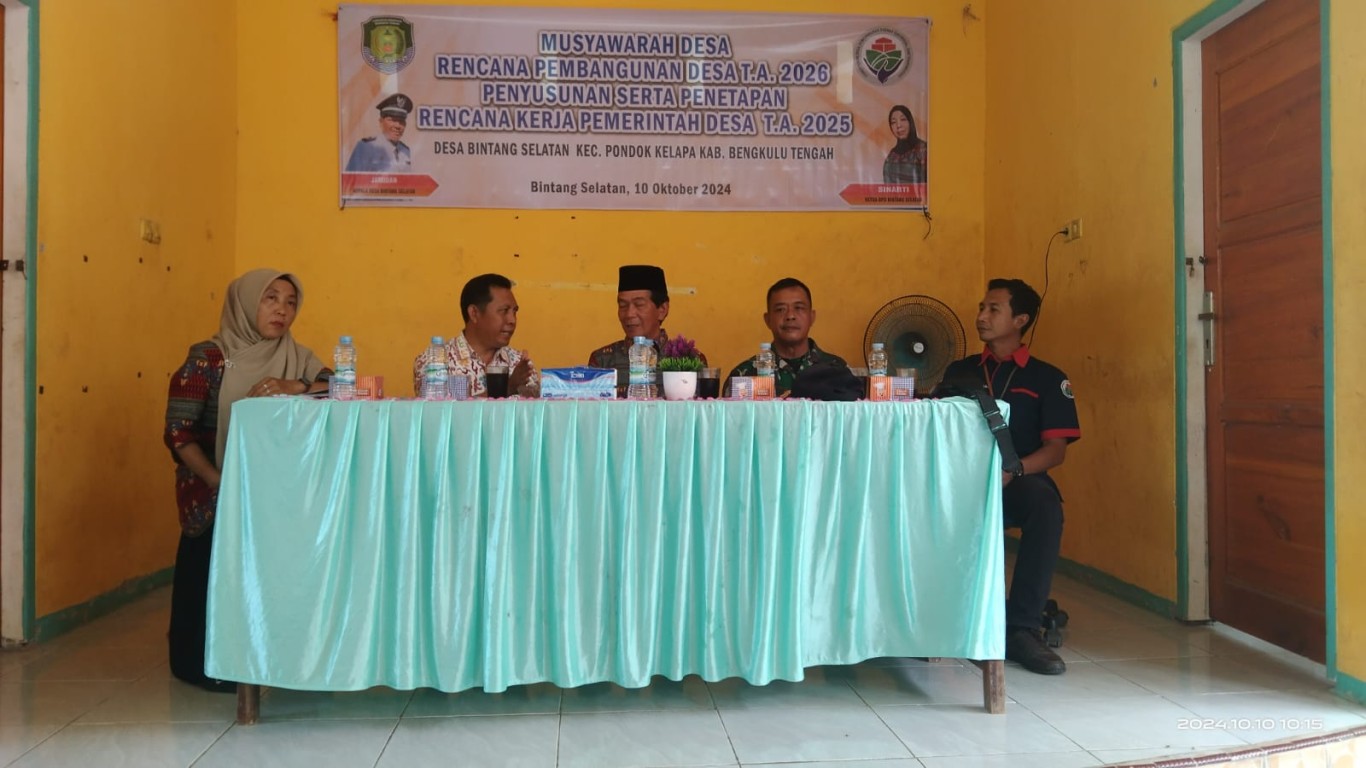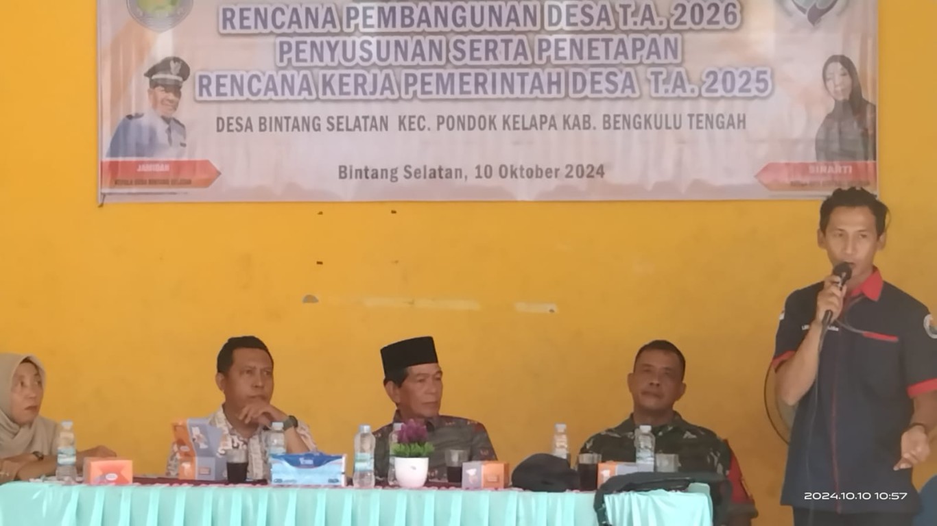 10 Desa dari 17 Desa di wilayah Kecamatan Pondok Kelapa telah melakukan Musyawarah Perencanaan Pembangunan Desa. Pada Hari ini Kamis 10 Oktober 2024 Desa Bintang Selatan menggelar forum musyawarah tahunan yang dilakukan oleh Pemeritahan Desa yang mana Musrenbangdes merupakan salah satu mekanisme penting dalam sistem perencanaan pembangunan Desa Bintang Selatan.