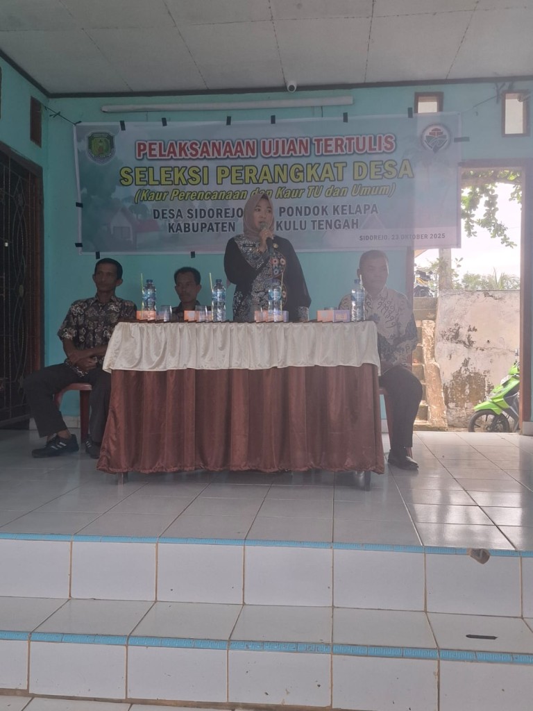 Camat Pondok Kelapa Ridulima, S.Sos., A.Kp., M.A.P menghadiri Ujian Tertulis Seleksi Perangkat Desa Sidorejo yang dihadiri oleh Camat, Sekretaris Camat, Kasi Pemerintahan, Kasubbag Perencanaan dan Keuangan beserta staf Kecamatan, Kepala Desa beserta perangkat Desa, Kasi Dinas Pemberdayaan Masyarakat Desa Bengkulu Tengah beserta 6 orang peserta Ujian. Pada hari Kamis, 23 Oktober 2025.