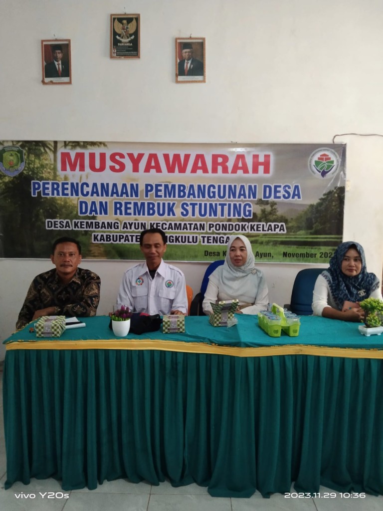 Kegiatan Musyawarah Rencana Pembangunan Desa dan Rembuk Stunting di Desa Kembang Ayun. Dihadiri oleh seluruh elemen masyarakat,Anggota BPD,KADES,CAMAT,TOKOH ADAT,TOKOH MASYARAKAT Dan Kepala Puskesmas Perawatan Sidodadi.