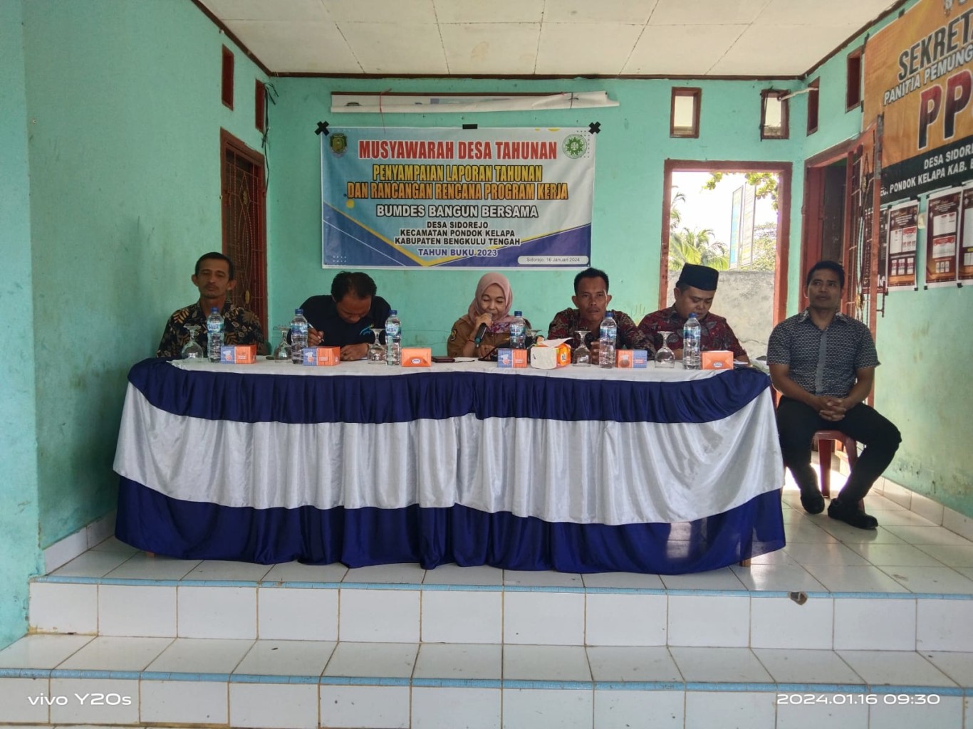Camat Pondok Kelapa Lismawati, S. IP. hadir dalam Musyawarah Desa Tahunan Penyampaian Laporan Tahunan dan Rancangan Rencana Program Kerja Bundes Bangun Bersama Desa Sidorejo Kecamatan Pondok Kelapa Kabupaten Bengkulu Tengah Tahun Buku 2023
